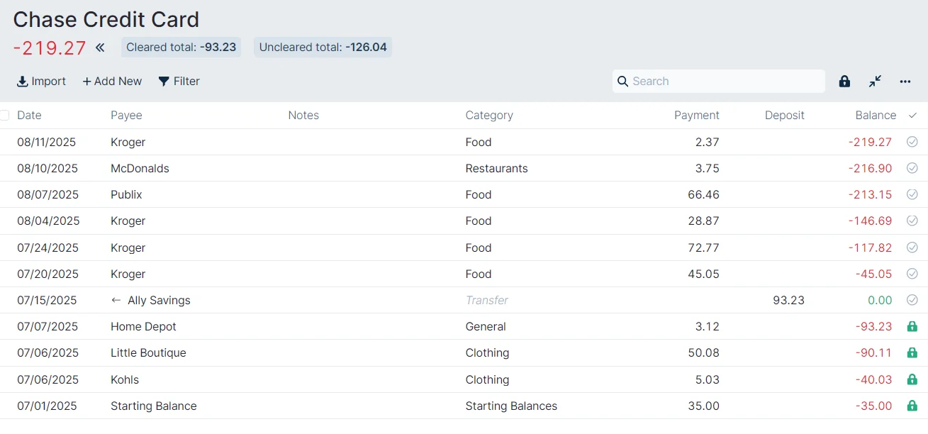 When we reconcile our account for this first month, we clear all of the June purchases and payments (which should be part of the "Starting Balance") in one lump. In our case their lump sum is $35.00.