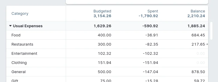 From the Budget screen, you can see I've spent every last dollar of my clothing category for the month.