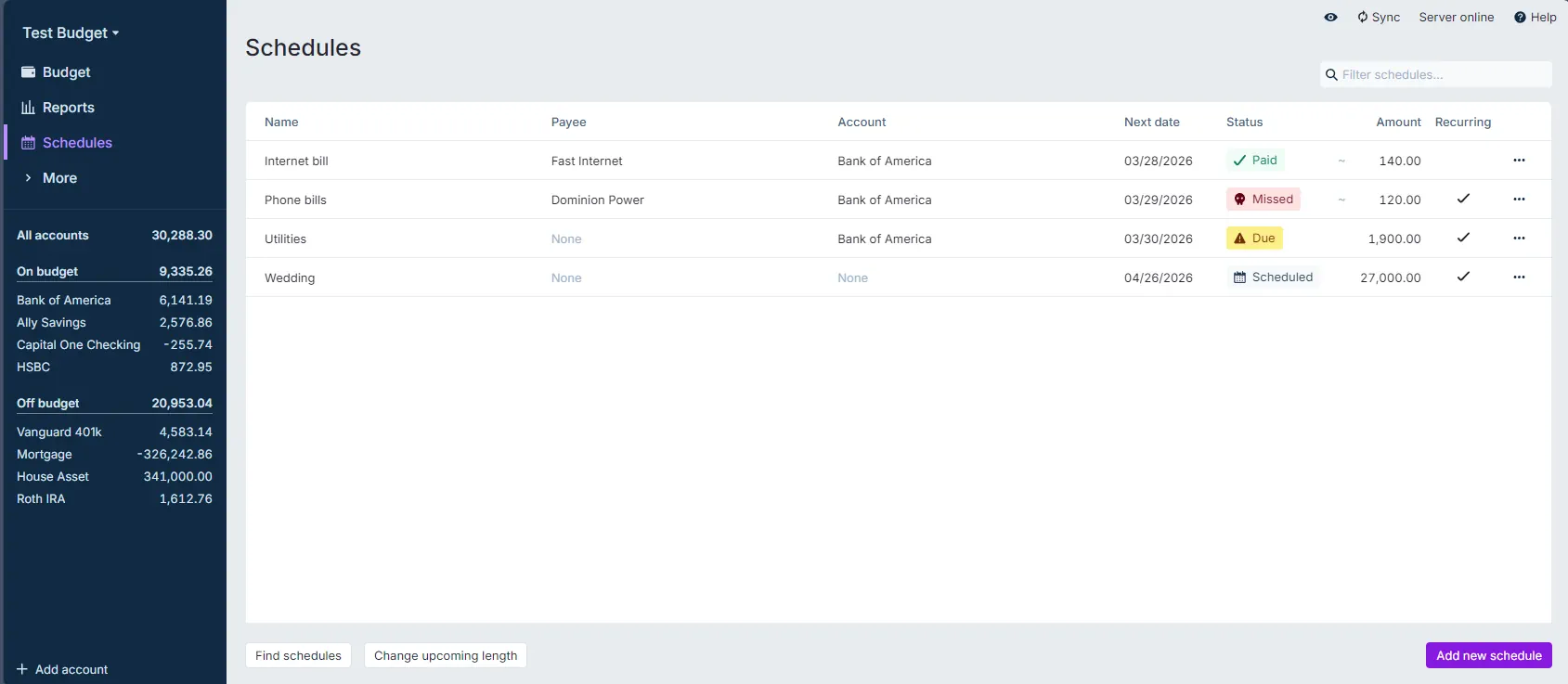 • The schedule can enter the transaction automatically into the account register or notify you to manually approve entry.